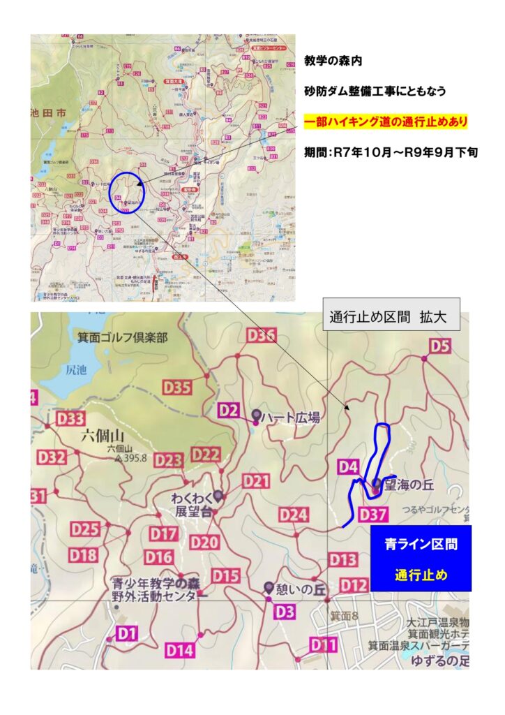 • 教学の森内の一部ハイキングコースで工事にともなう通行止め区間があります