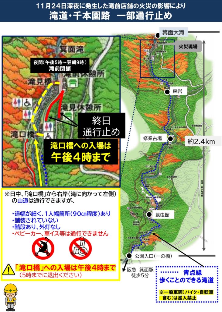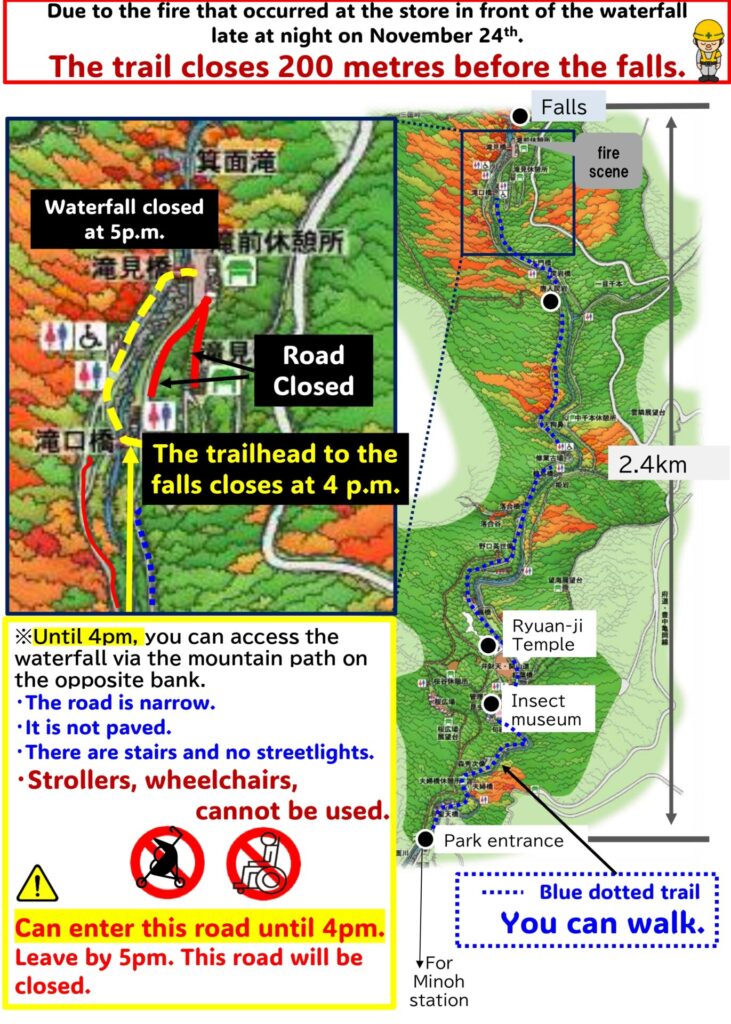 滝前エリアへの入場は、午後4時まで(※滝前、店舗火災の影響により遊歩道一部通行止め、午後5時:滝前閉鎖)(12月1日11:00更新)