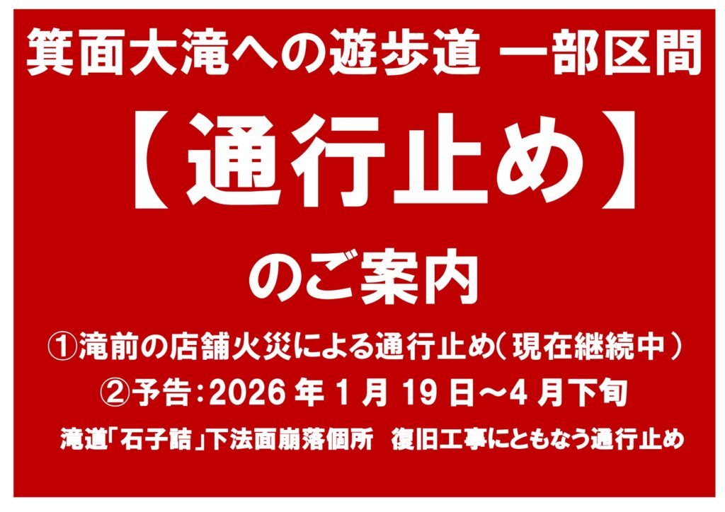 箕面大滝への遊歩道で通行止め区間があります(現在、通行止め中・工事に伴なう通行止め予告)