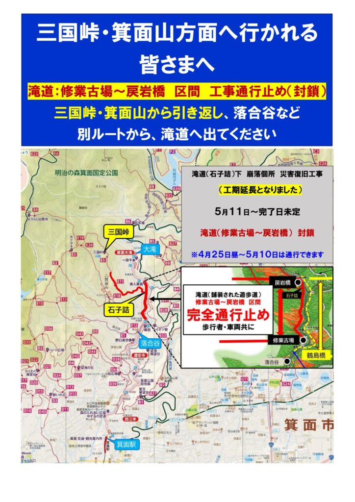 ハイキングやランニングで三国峠、箕面山方面へ行かれる皆様へ(5月11日から~未定期間:工事に伴なう通行規制あり)