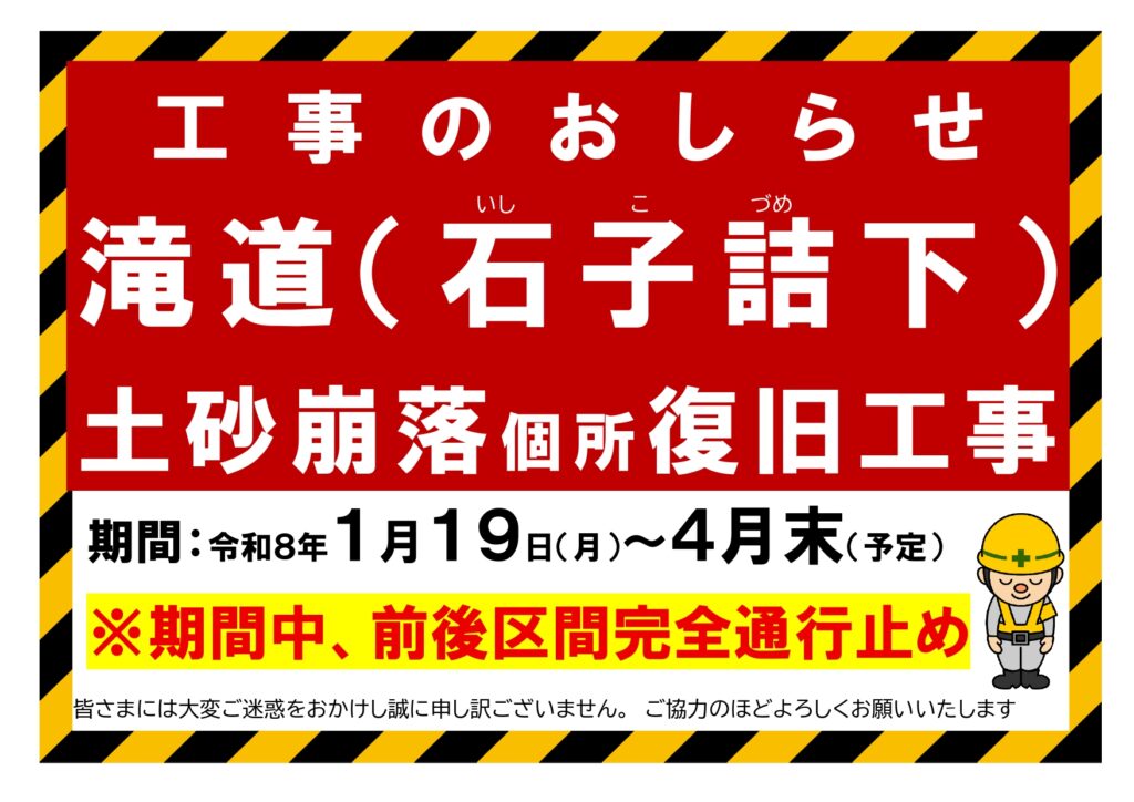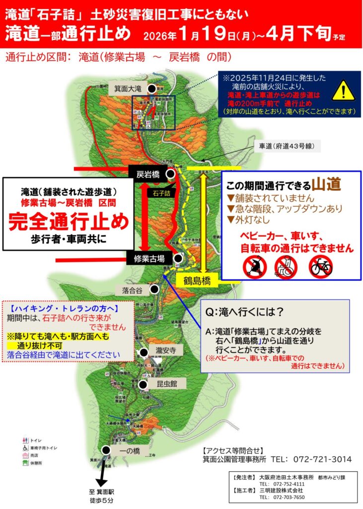 2026年1月29日夕方~4月下旬【滝道一部区間通行止め】土砂崩落個所の復旧工事(※対岸の山道を通り滝へ行くことができます)