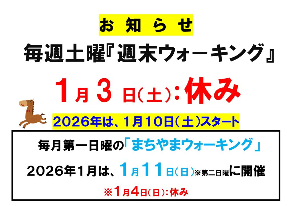 2026年1月 毎週土曜「週末ウォーキング」・第一日曜「まちやまウォーキング」について(休み、日程変更があります)